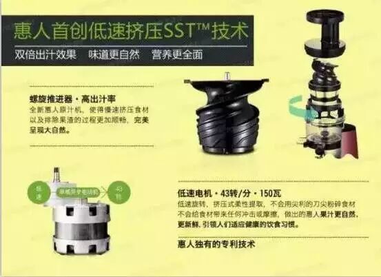 惠人的40年努力与历史,成就出了其代表性产品——惠人原汁机。采用惠人的低速压榨TM专利技术,制作出留有原原本本的大自然营养与味道的惠人原汁机,在世界上最先形成了原汁机市场,并通过“原汁”创造了标新立异的健康文化。现在,每年有一千万的顾客选择惠人原汁机体验着原汁带来的健康。