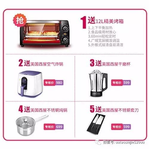 5、全赠品套装秒杀价:2080(烤箱+空气炸锅+干磨杯+刀具套装+锅具)