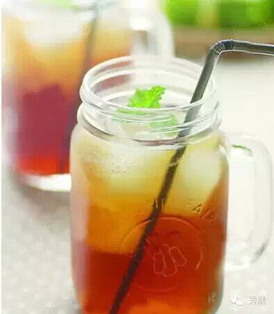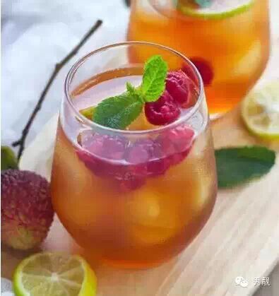 8、薄荷糖浆取100ml放入红茶中,水果放入红茶中,冷藏饮用口味更佳
