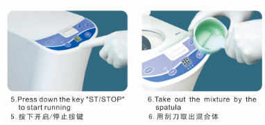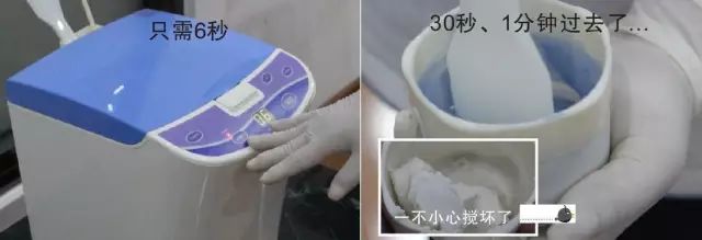 (9)经确认过机器已停止转动后,才可能将机盖打开并取出搅拌杯,再以搅拌刮刀即可轻易取出印模材料。