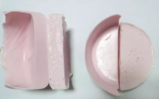 图为:左边DB-988搅拌机搅拌的切面:优质均匀没气泡和右边手工搅拌的切面:粗糙不均匀气泡多对比