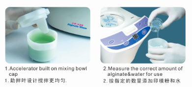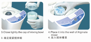 注意:若搅拌碗盖未锁紧时,在搅拌中将会造成印模粉飞散的现象,并造成机器故障,因此应将搅拌盖锁紧。