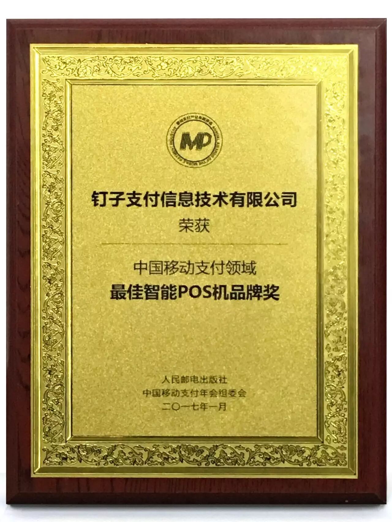 (图:钉子支付”最佳智能POS机品牌奖“奖牌)