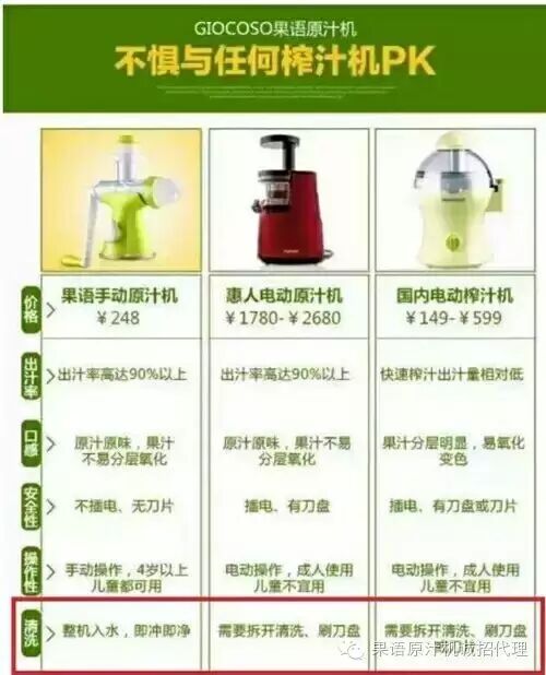 1:果语原汁机:通过螺旋挤压的方式,汁渣分离的形式结构依靠人力驱动的摇杆实现了真正低速挤压,转速仅仅20转/分钟,完美适应不同软硬水果所需要的挤压速度和力量,避免破坏蔬果的细胞结构,营养百分百保留。另外低速旋转不会产生高热度,让柔取的果汁不会因受热而氧化或造成营养的流失,可以说是榨汁机历史上的一个里程碑。原汁机绝对不能称之为“榨汁机”,可称它为一款完美的“营养提取机