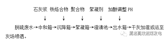 脱硫废水经石灰浆处理后PH控制在8.5~9.0,可去除除汞、镉以外的重金属离子,再加入有机硫化物等重金属捕捉剂,通过机械搅拌创造合适的反应梯度使废水中大部分重金属形成沉淀物,并沉降下来。有机硫化物投加量约为15~50ppm,加入后约每10分钟搅拌一次。澄清池底部的污泥经脱水机脱水后,运至灰场堆放。脱硫废水至湿式搅拌机的管道、喷嘴要使用耐腐蚀的材料。