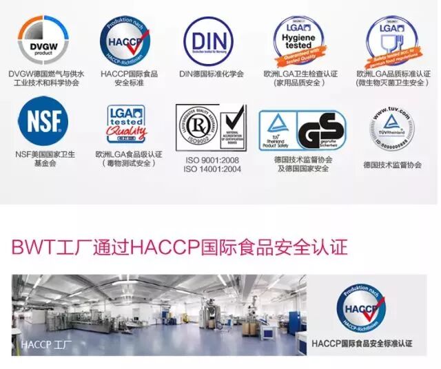 BWT是全球率先采用HACCP(国际食品安全)认证的企业,该认证是目前世界公认的食品卫生严谨且有成效、预防性之自主式制程管理系统,可确保食品加工者为消费者提供更安全的食品。HACCP认证标准贯穿整个生产过程,从原材料的供应,直到成品储存,乃至发售环节,包括消费终点在内,均严格遵循。