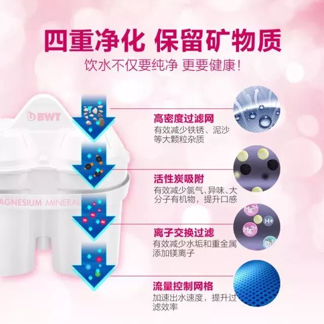 BWT滤水壶凭借其全球独家镁离子专利科技滤芯,一方面可以过滤水中的有害杂质,有效减少:氯气和其他气味、重金属(汞、铜)、农业化合物(农药残留等)、工业污染物(苯)、铅、水垢等,过滤掉杂质的同时适当保留自来水中原有的天然矿物质;