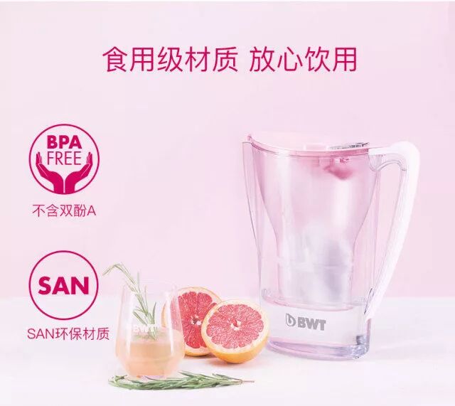 BWT滤水壶的制作材料为优质树脂,不含双酚A,抗压性强,不易破裂,这个材料也特别耐磨,我家的用了两年多了,壶身还是透透亮的,完全没有划花、发黄、老化。