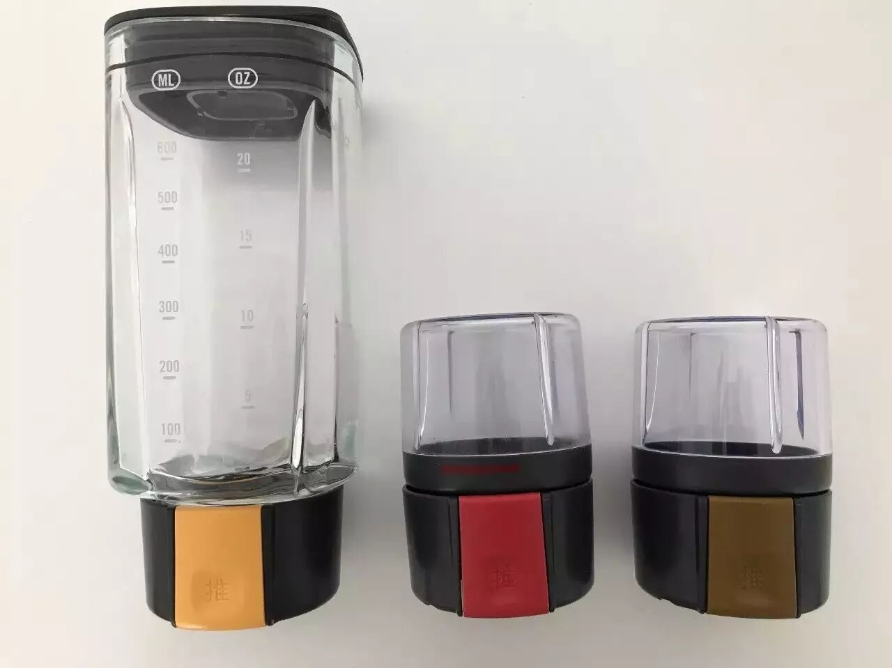 最大的是搅拌杯。玻璃杯体+杯盖+黄色标识 ,可以用来制作果汁,果昔,冰沙,奶昔,浓汤、蔬菜泥等等;