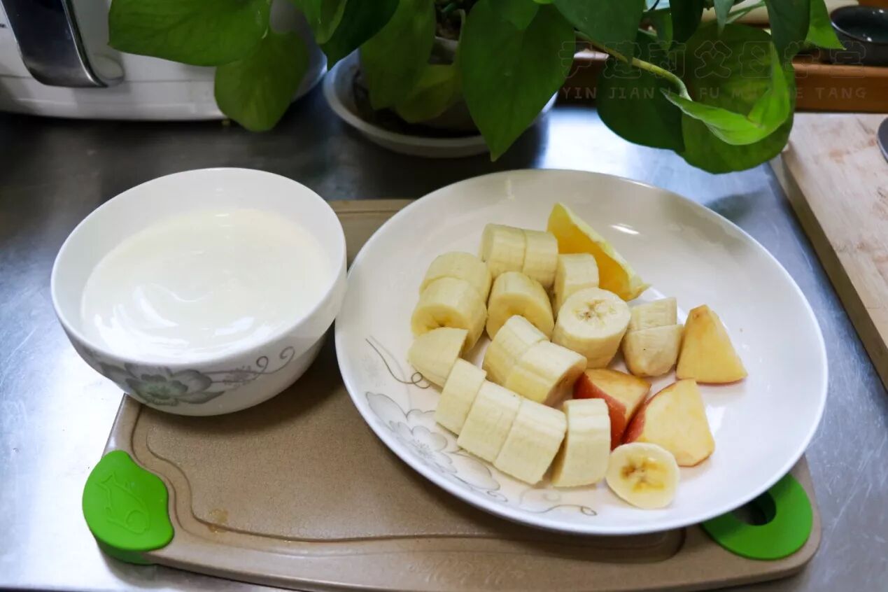 苹果、香蕉简单的切块后,倒入搅拌机内,不用加清水,直接加酸奶,也可以是牛奶。