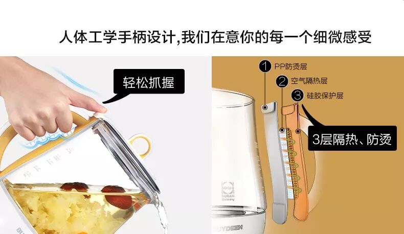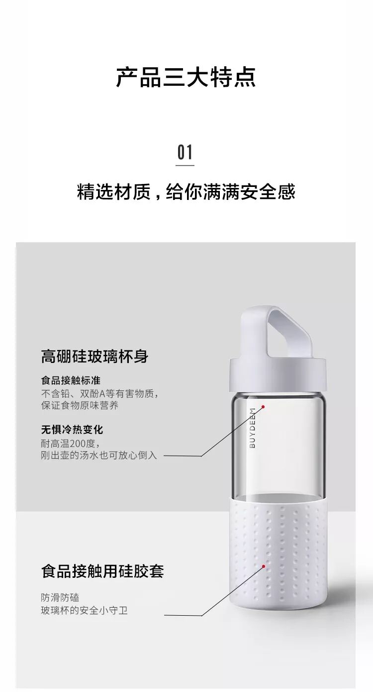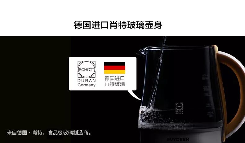 先说它的壶身玻璃采用的是德国肖特玻璃,符合GB 19778-2005食品接触标准,无有害物质挥发,保证食物原味营养。