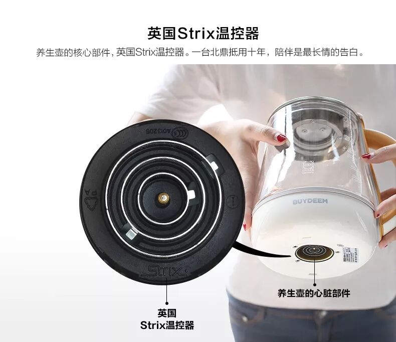 一款养生壶的核心部件,就是温控器。北鼎的温控器是英国Strix的,Strix是目前做温控器最好的牌子了。一台北鼎可以用十年,真是最超值!