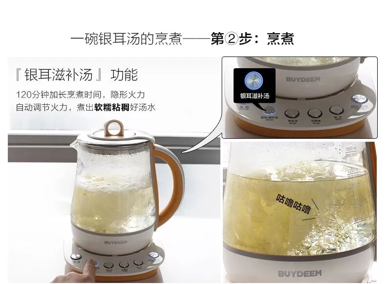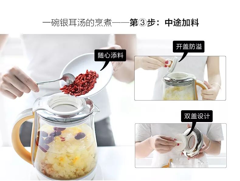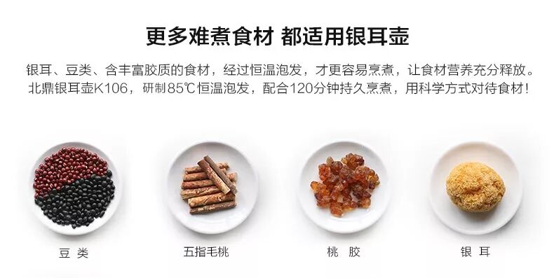 虽然它叫银耳壶,但功能可远不止炖煮银耳这一项!什么养生汤、花果茶用它煮都没有问题!还有一些食材像豆类、桃胶、皂角米,一般都要泡一夜才能煮的,用这款银耳壶,它有独特的85度恒温泡发功能,两小时即可炖煮!