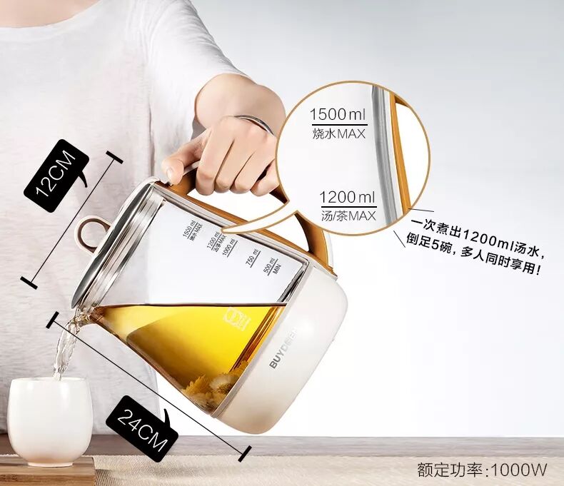 这款北鼎养生壶有1500毫升的容量,可以轻松满足一家三口的需求(普通家用碗,差不多可以倒出4-5碗)