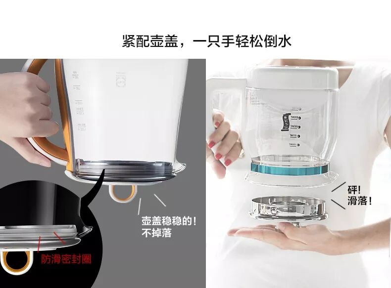 最契合的壶盖与壶口,360度任意翻转壶盖也不会掉落,让您一手轻松倒水!