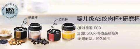 其次,两个小杯虽然不是玻璃材质,但是通过德国LFGB,法国DGCCRF等食品级检测的婴儿级材质的绞肉杯+研磨杯,标注“BPA FREE”。
