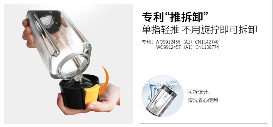 当用完需要拆卸时,不需要费力旋转打开,只要轻轻一推就开了,非常方便。不用担心机器在运行的过程中,因刀片的旋转而使杯体松动。也不用担心食材搅拌好后在旋转杯体时,因盖子没拧紧而使食材洒在机器内。