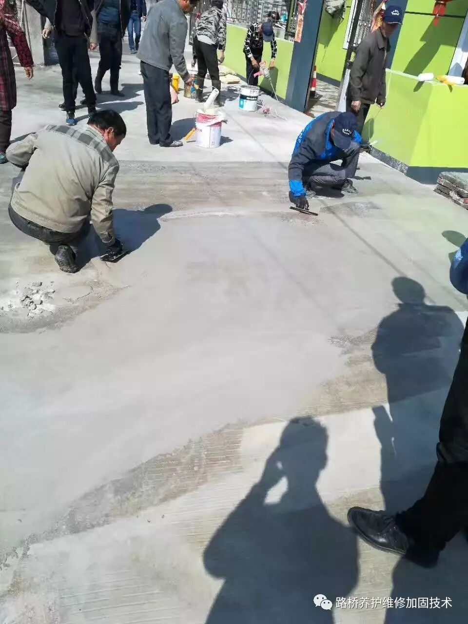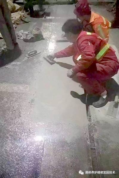 将搅拌好的护砼一号成品料直接浇倒到待修补区域中间并用抹子对其压实、抹平施工。