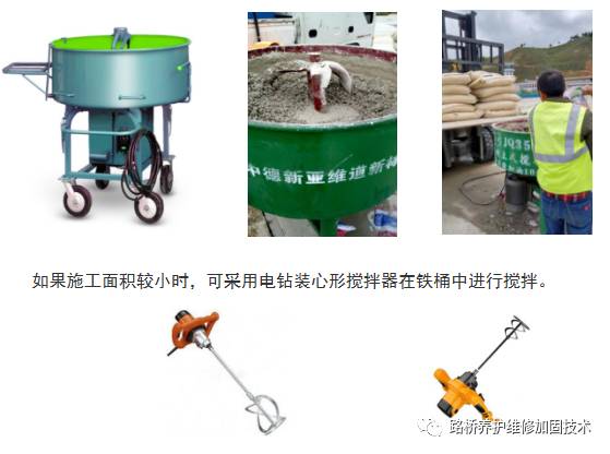 护砼TM一号应采用强制式砂浆搅拌机(盘式砂浆搅拌机)进行搅拌,搅拌时间控制在6~10分钟。搅拌过程中应用铲刀把搅盘周边未搅拌到的粉料铲入盘中混合,如发现成团的粉料应用铲刀压碎捣匀。如果施工面积较小时,可采用电钻装心形搅拌器在铁桶中进行搅拌。