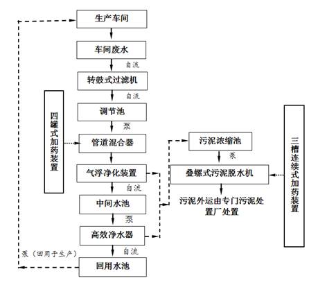 污泥处理系统:废水处理系统所产生的剩余污泥排至污泥浓缩池,污泥浓缩后,由泵提升至叠螺式污泥脱水机进行污泥脱水,干泥外运由专门的污泥处置厂处置或填埋处置。