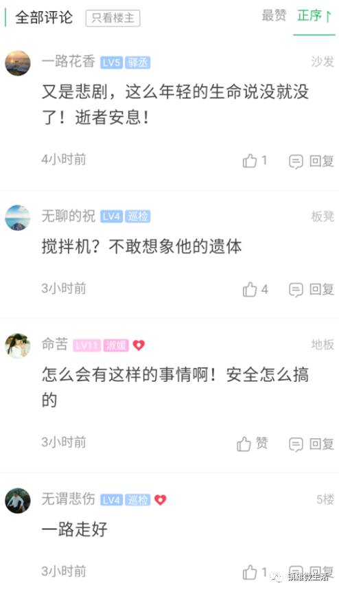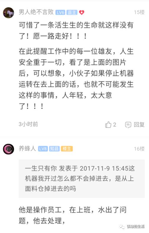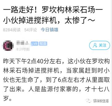 近日,网友在镇雄微生活APP发帖:镇雄罗坎构林搅拌站一小伙掉进搅拌机遇难了,小伙是盐源乡付家寨人,今年还不到20岁,是搅拌站的操作员,据说当时小伙正在上班,供水系统出问题,他就去处理,结果不知道怎么弄的就掉进去了。昨天下午2点40分左右发生的事,到了下午6点左右才被取出来,太惨了。