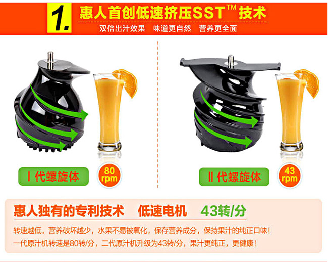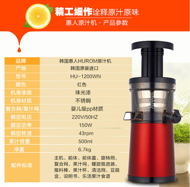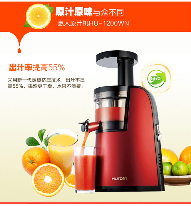 家用送礼HU-1200是2014年4月份上市的韩国惠人原装第二代机器,HU-1200是每分钟43转。优美的外观设计采用了不锈钢拉丝烤漆。转速越低果汁的味道越好营养保留的越完美!单刃螺旋升级为双刃螺旋更好的进行挤压,和充分利用,榨汁结束后残留更少,过滤网采用两个黑色ULTEM材质的强化网 ,更加耐用!【临平长城电器有售】