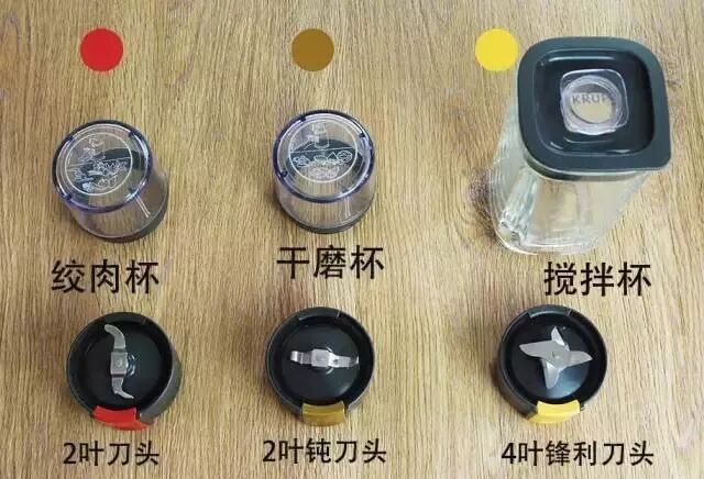 KRUPS在这方面考虑很贴心,采用了不同颜色的按钮设计,黄色为搅拌杯,模仿新鲜水果的视觉效果;红色为绞肉杯,模仿新鲜肉类的颜色;咖啡色为干磨杯,模仿咖啡豆的颜色。非常好记,大家不用担心自己记混了,也不用一遍一遍嘱咐家里老人了。
