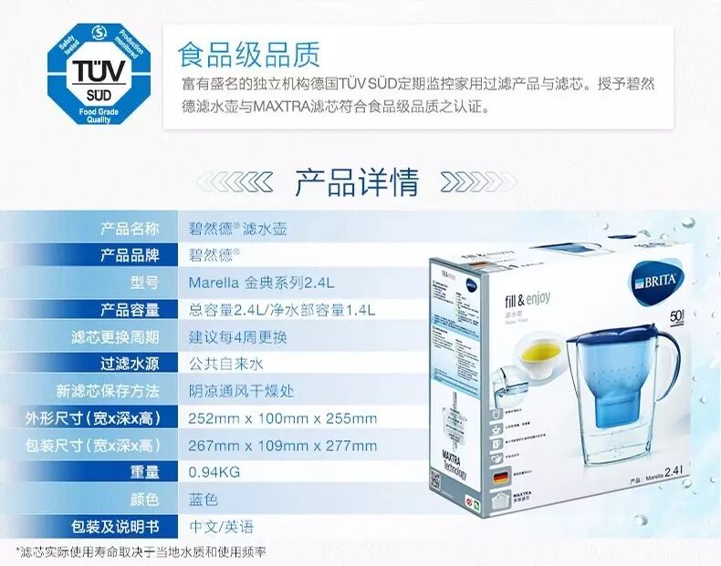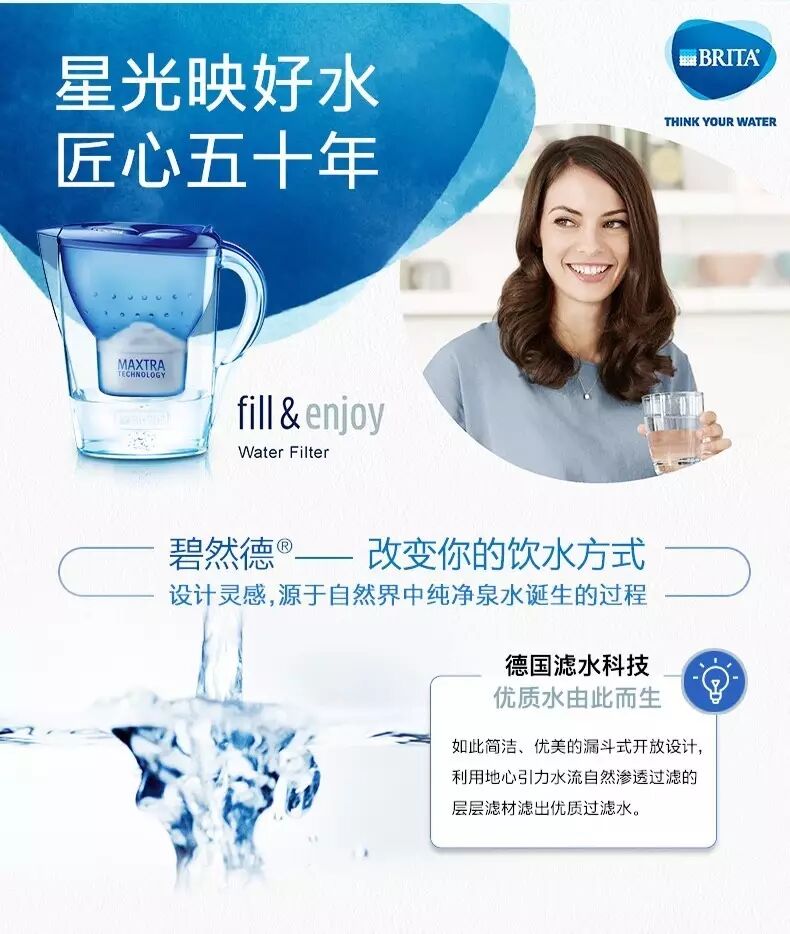 碧然德(BRITA)滤水壶采用了滤芯更换显示器提醒功能,只要长按6秒即可显示滤芯使用情况,是否更换一目了然,非常人性化!