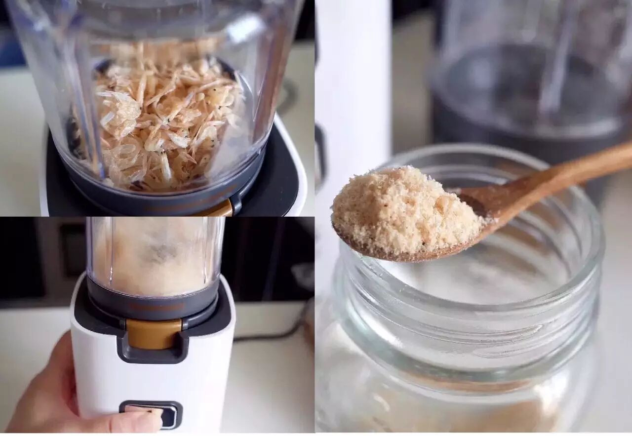 把虾皮用干磨杯打成粉,可以取代盐,而且还补钙!