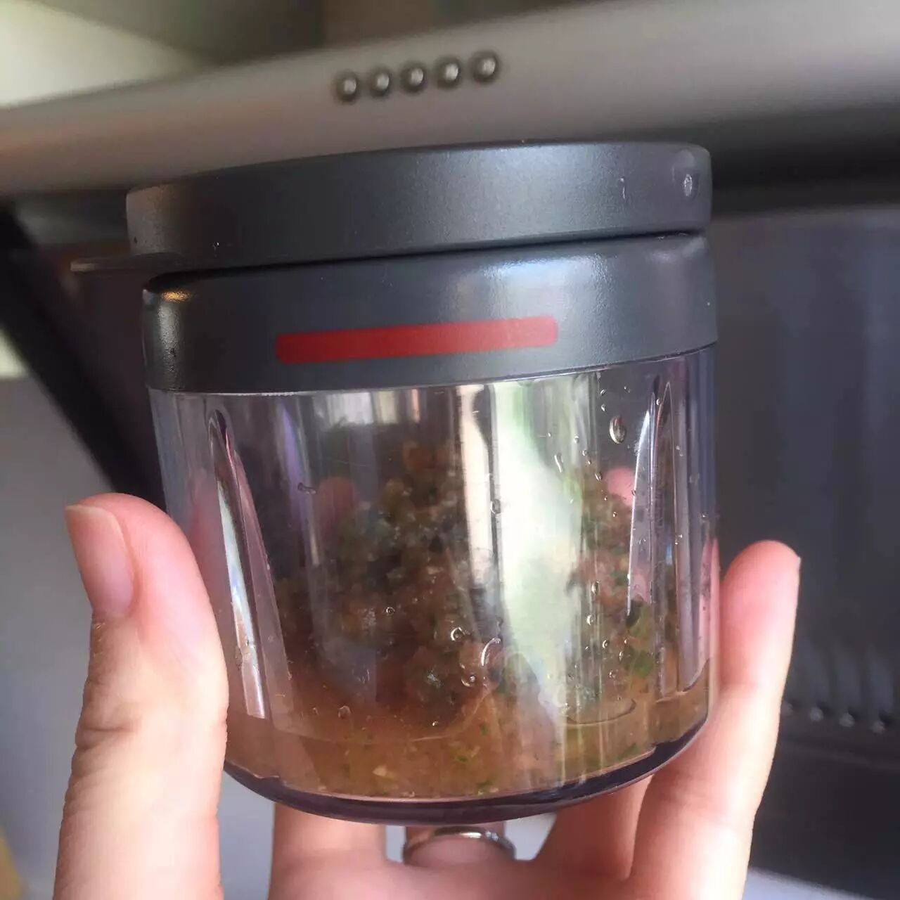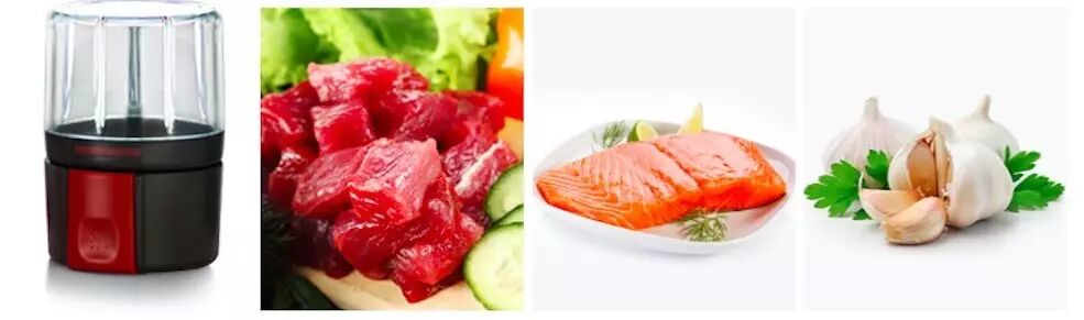 红色标志刀头配小有机玻璃杯,是绞肉机,专门搅拌肉类的食材(一般建议打生肉,但阿琬亲测研磨熟肉完全没问题),猪肉、牛肉、鱼肉、虾肉统统快速搅拌成泥,可以做成丸子,肉馅或者肉松。要注意,每次加入的量不要超过80g。
