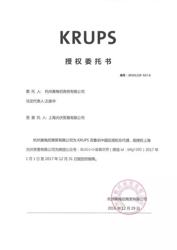 以下是KRUPS在中国总代给阿琬的授权书,本次团购由总代直接从上海发货,团友可以放心下单!