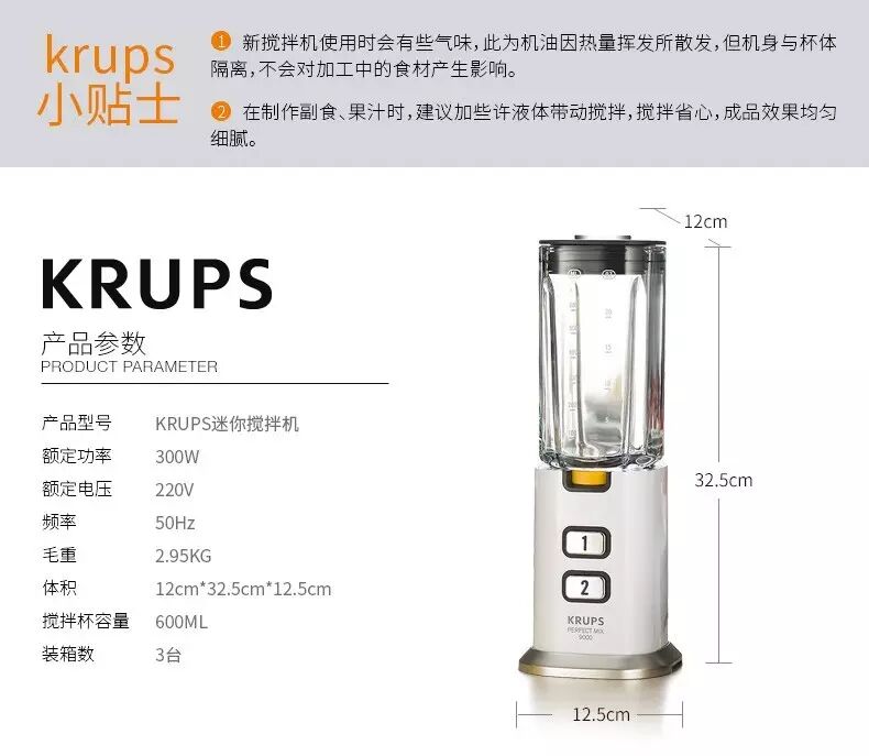 3、Krups有快慢两档搅拌速率可选,第一次使用,先点按1健2秒之后暂停,再点按2秒暂停,如此反复直到把食物搅拌好,这样有助于机体试运行更顺畅,不会突然加热过度导致机体保护暂停。之后每次按也最好不要超过30秒哦!