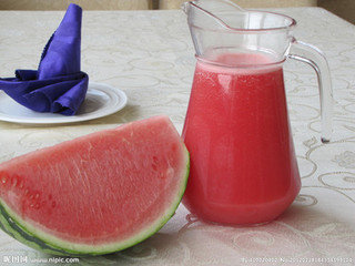 作法:西瓜切皮去籽后切成小块,柠檬去皮也切成小块与蜂蜜和冰块一起打成西瓜汁。