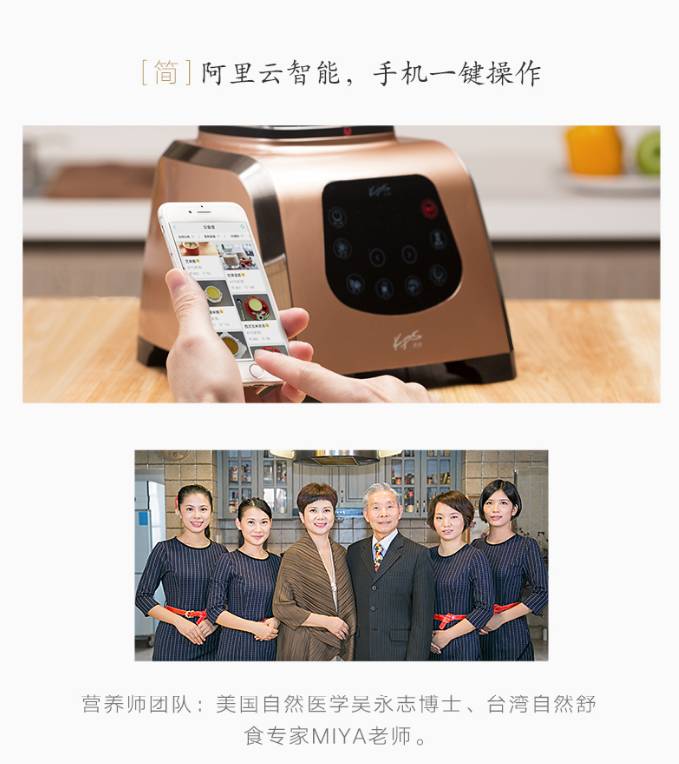 跟手机app连接,配料放破壁机内,手机就能控制破壁机,一键开煮。app有非常多的食谱和营养知识,再也不用发愁吃什么?怎么吃才能更营养。