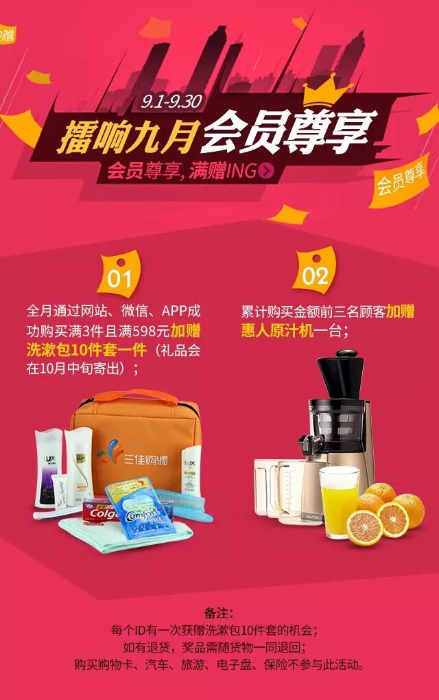——1) 全月通过网站、微信、APP成功购买满3件且满598元即可得洗漱包10件套一件(礼品会在10月中旬寄出);