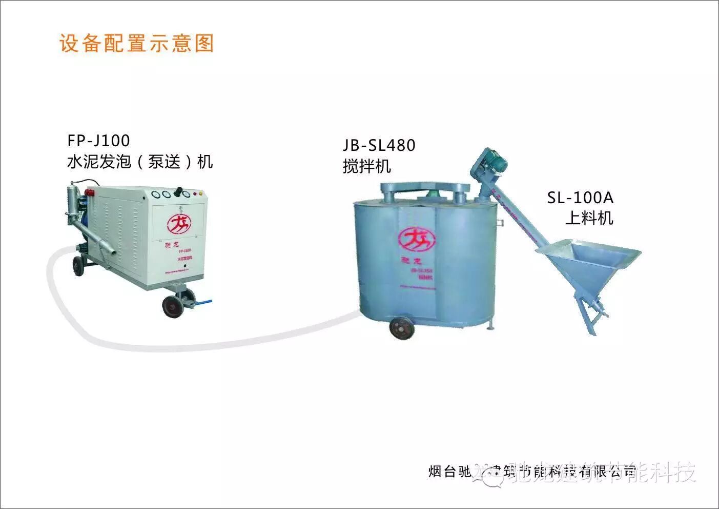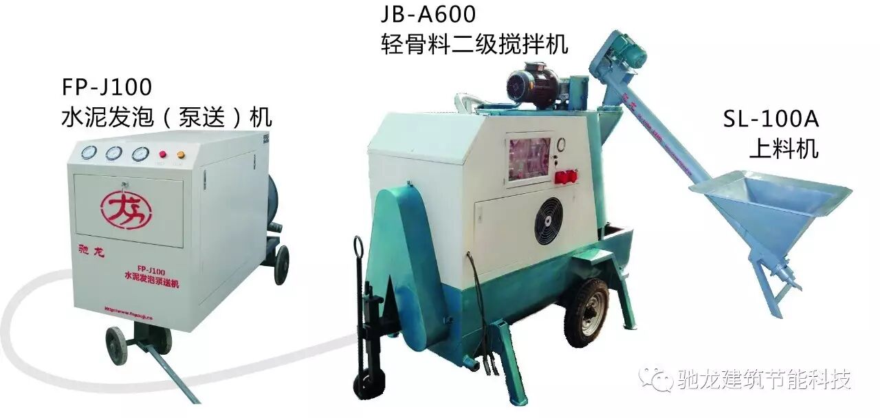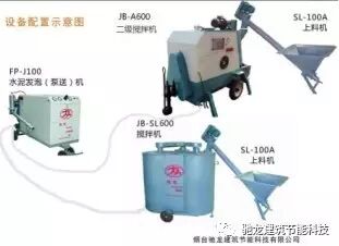 这种浇注工艺,是与目前屋面保温现浇施工的工艺相同,该设备是将上料、搅拌、发泡、混合、泵送几道工序连为一个系统,形成一套完整的自动运行流程,所采用技术均为满足泡沫混凝土的质量指标而配置的,上料机采用螺杆式可调上料机,这种上料机能满足计量和调控功能,搅拌机是采用最新专利技术;“立式双桶差速”搅拌机,这种搅拌机是目前连续上料的最佳浆料混合设备,它不仅具有强力的搅拌作用,更具备在连续上料的情况下,其输出浆料不会带入未搅匀的颗粒输出,即输入和输出的料始终保持一个2min的有序时差,干料和颗粒只能在上料桶停留,未成浆料前不能进入出料桶,相当于单桶搅拌机投料后,继续搅拌2min后才开始出料,这是目前连续作业的必备专用搅拌机。