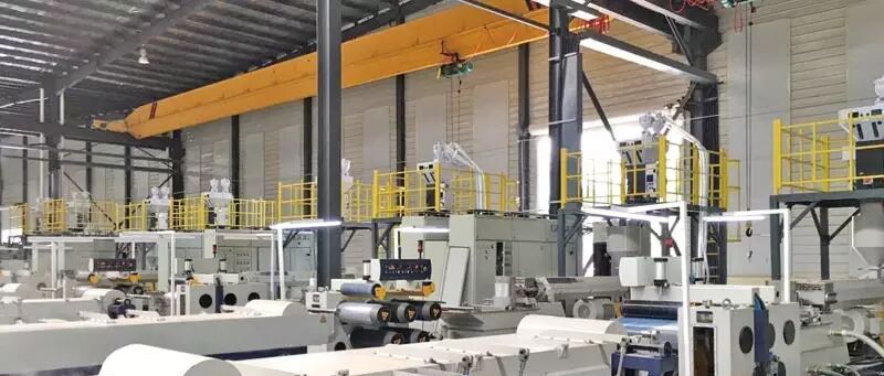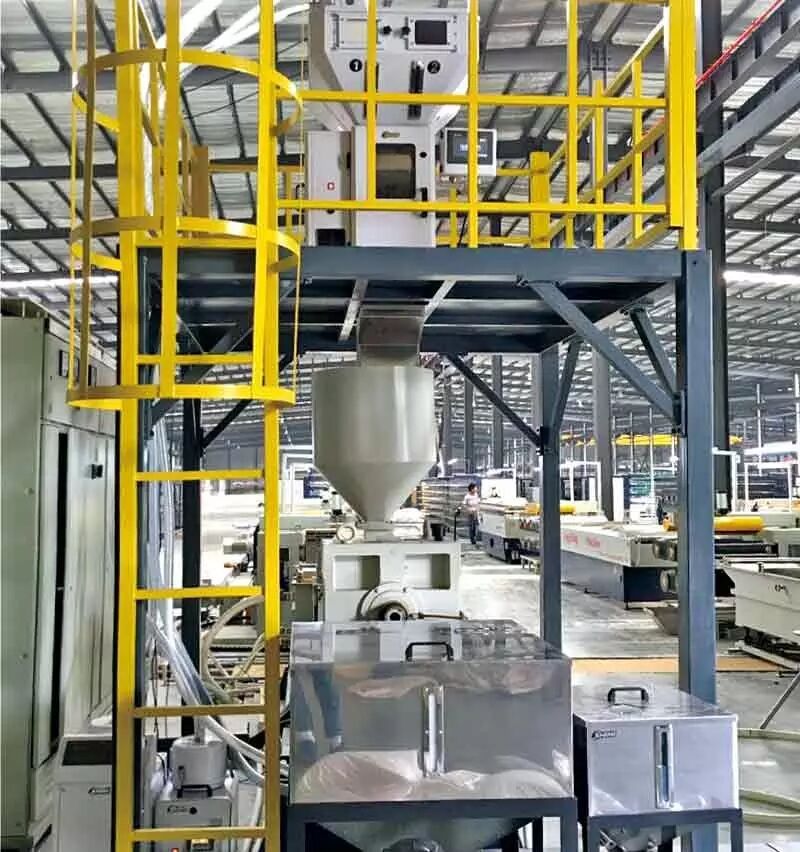该公司的一项主营业务为生产遮阳布。遮阳布的用料为胶丝,而胶丝由挤出机挤出而成。该系列产品主要用于出口,故对产品严苛要求,其织布机均为进口品牌,共有15条拉丝机生产线,用于生产扁丝及圆丝,初期产品使用两组分,分别为原料及色母。在与客户进行了深入沟通探讨之后,我们建议客户每条拉丝线配备一台SGB-600-4秤重式拌料混合机,实现对两种组份精确比例混合。