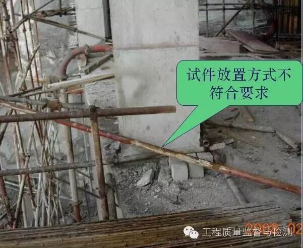 ① 同条件养护试件未随主体结构上升搁置在楼层上,只养护试件不养护混凝土构件。② 施工用水管未随主体上升安装在楼层上。