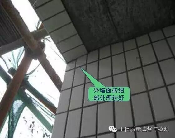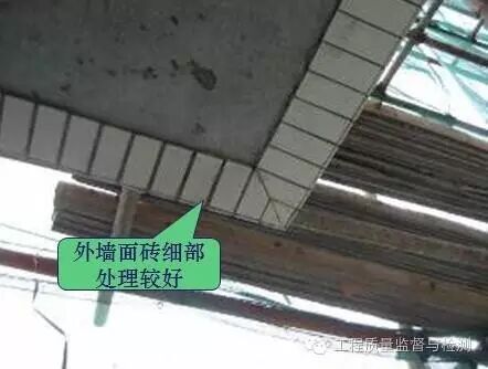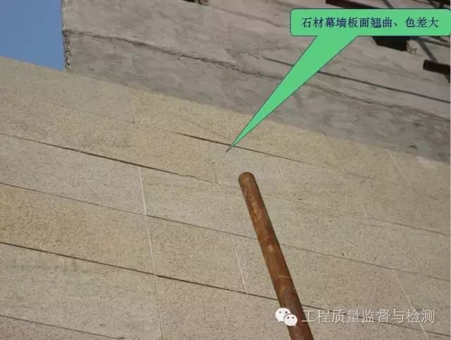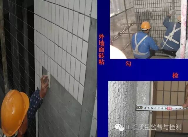 ① 材料进场应认真进行验收检查,面砖、石材的表面应光洁、方正、平整、质地坚固,其品种规格、尺寸、色泽或图案应均匀一致,按规定进行抽验。② 施工前应作样板,屋面机房处墙面试拼,检验后(抗拨)合格后方能大面积施工,面砖拼缝宜采取勾缝。③ 外墙干挂石材幕墙应对龙骨和后置埋件进行严格的隐蔽验收(节点、防锈等检查)石材的连接件应为不锈钢,严禁使用镀锌件。