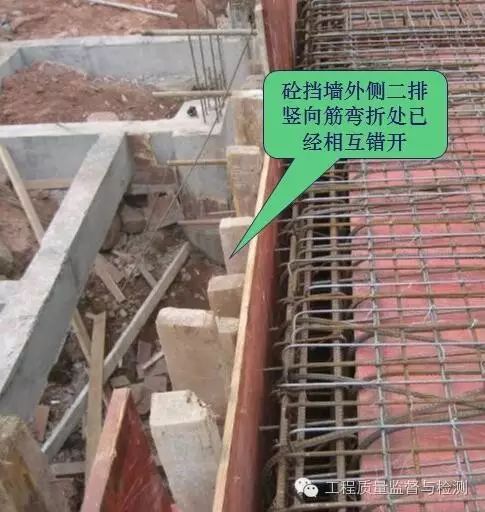 ① 配料时未考虑外排钢筋与内排钢筋的高度不同。② 钢筋连接时未按外排钢筋高于内排钢筋安装。