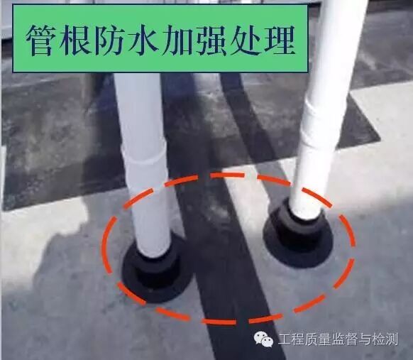① 凡有返水要求的房间(如卫生间)管道套管应加设带止水环的金属套管或塑料止水环,安装在阳台、厨房内的套管,其顶部应高出装饰地面50mm,底部应与板底相平,套管与管道之间的缝隙应用沥青油麻填实,端面光滑。② 套管与楼板、烟道与楼板的缝隙应用细石混凝土内掺微膨胀剂(板底撑模)捣实(分2次浇筑),缝隙≥50mm应附设Φ6环形箍和板筋焊接,细石混凝土初凝后,蓄水养护不渗漏后再进行防水施工。③ 套管、烟道后塞口处防水应加强。