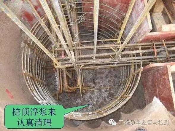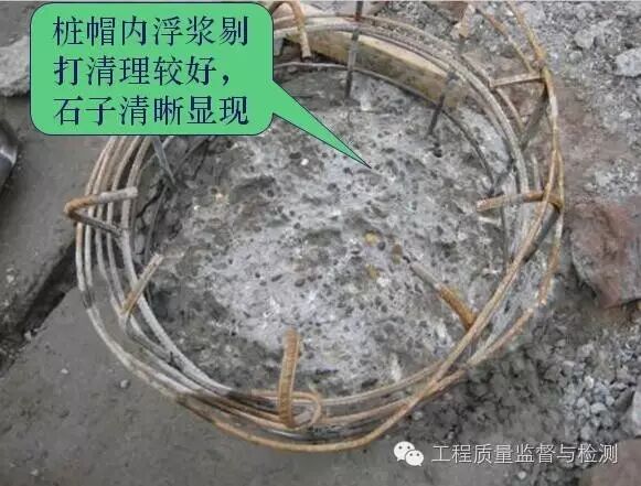 ① 桩浇筑混凝土应高于设计标高30~50mm,混凝土初凝前剔除部分桩顶浮浆,混凝土终凝后采用人工凿打见石子为宜。② 监理逐桩检查拍照。