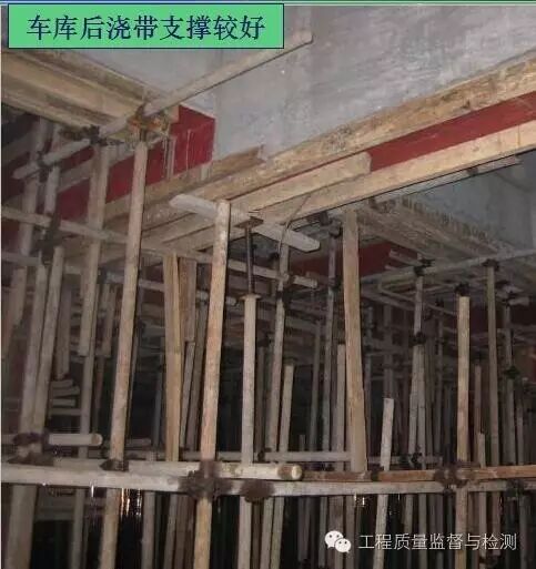 ① 后浇带二侧模板、支撑安装时未严格按方案实施,未形成独立体,混凝土徐变、应力线变形时间未达到。