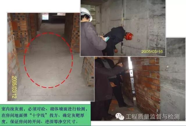 ① 室内抹灰前,必须对混凝土、砌体墙面进行检测,在房间地面弹“十字线”找方、确定灰靶厚度,保证房间的开间、进深等净空尺寸。② 室内墙面抹灰前应对房间方正尺寸进行检查,根据偏差值,在踢脚线(距楼地面150mm)位置打粑@2000mm,再复查房间抹灰打粑的尺寸,无偏差后依据打粑的实际厚度冲墙面抹灰厚度的竖向柱。