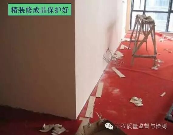 施工程序应严格按先天棚(管道、通风、电气、吊顶),其后墙面(线管敷设、开关、插座、抹灰、腻子、罩面)最后地面砖施工。地面砖施工中严禁上人踩踏,地面砖完成后洒水养护7d然后遮盖地毯保护。