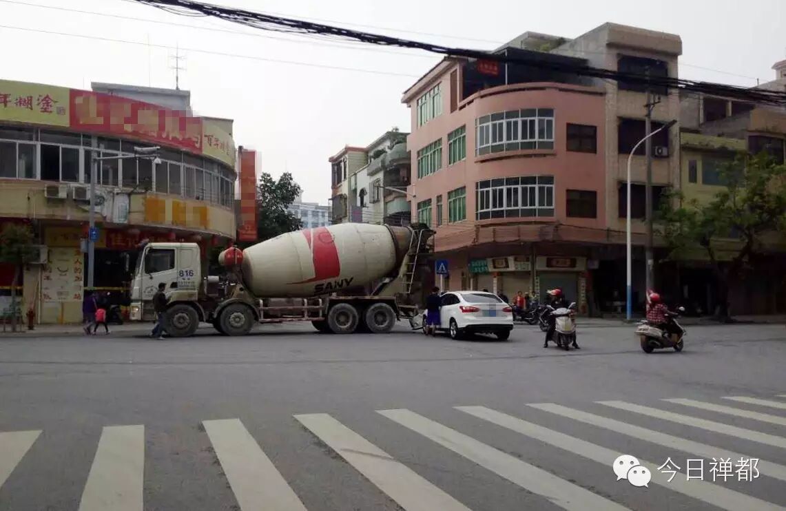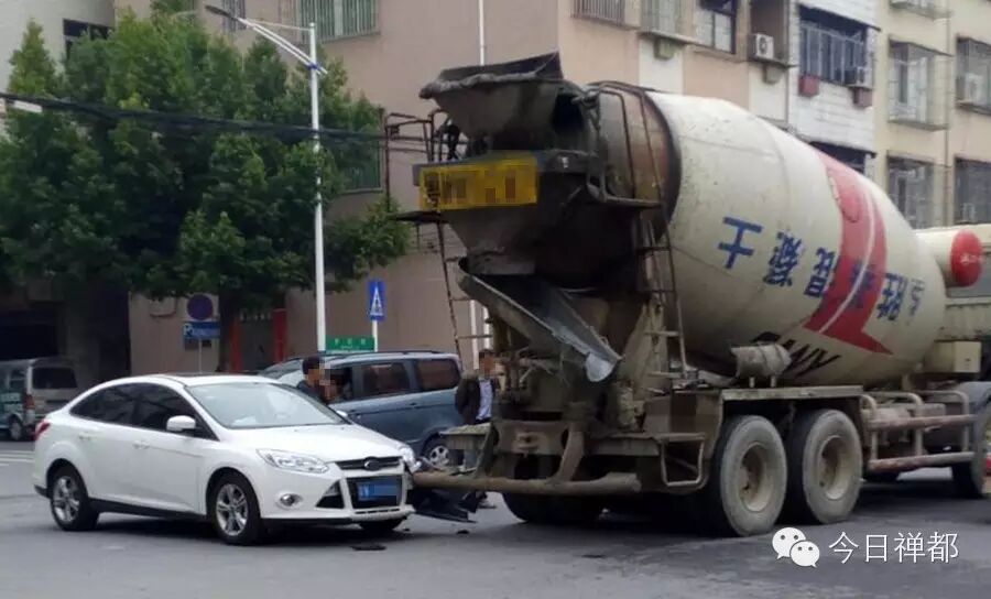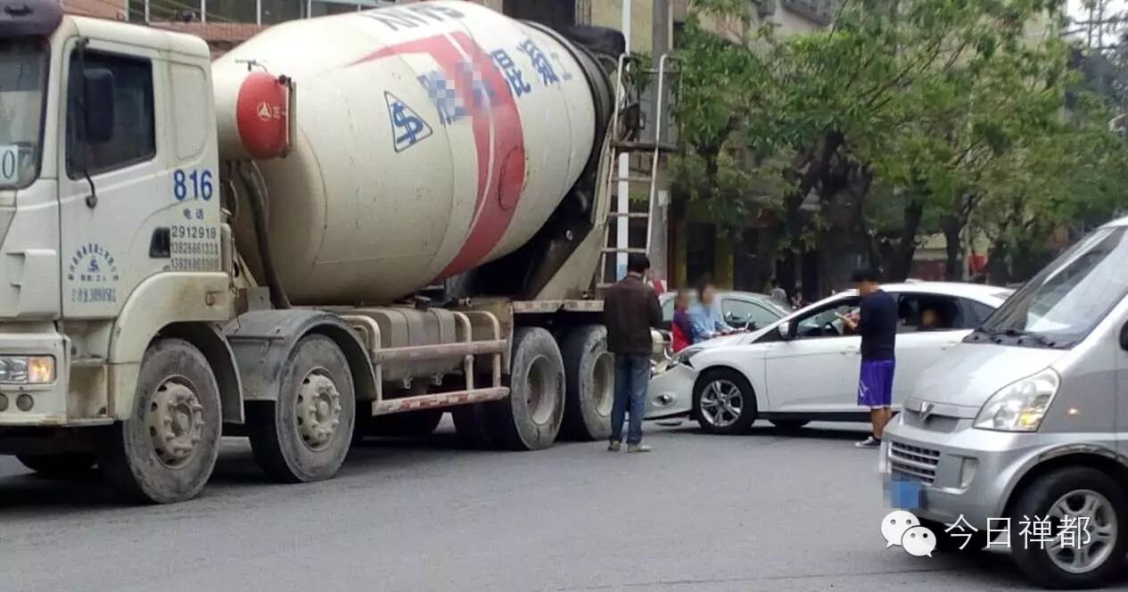 小车以及大型混凝土搅拌机就这样横在十字路口中间,由于周末早上出行的人较少,暂没有造成交通堵塞。