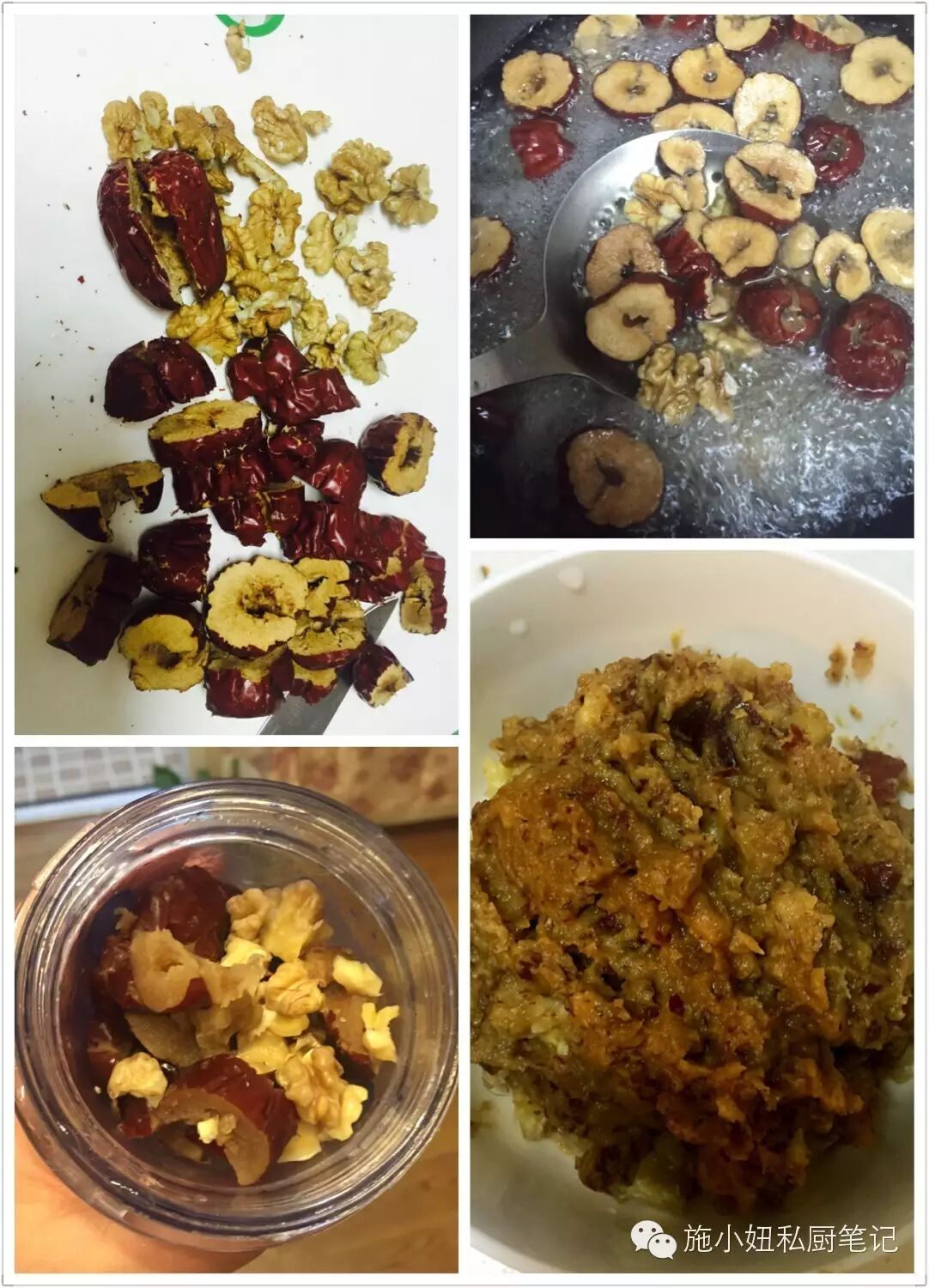b、栆切片,与核桃一起在水中煮啊煮~(煮的好处,对栆来说可以吸水变软便于后面打泥,对于核桃来说,煮一下,可以把核桃皮去掉哟)