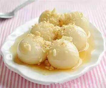 10)捞起放入碟中,浇上一些糖水,撒上花生芝麻碎即可享用。