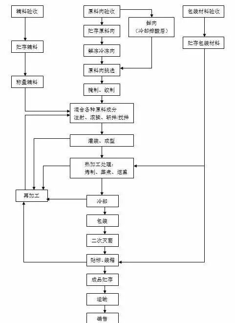 牛瘦肉20kg、猪瘦肉 20kg、猪肥肉 10kg、精盐 1.25kg、白糖 2kg、豆蔻粉 0.15kg、胡椒粉 50g、味精 75g、大豆蛋白 2kg、磷酸盐 75g、硝酸钠 20g、猪肉香精 0.3kg、冰水25kg、油桂粉、淀粉、红曲红色素 适量。