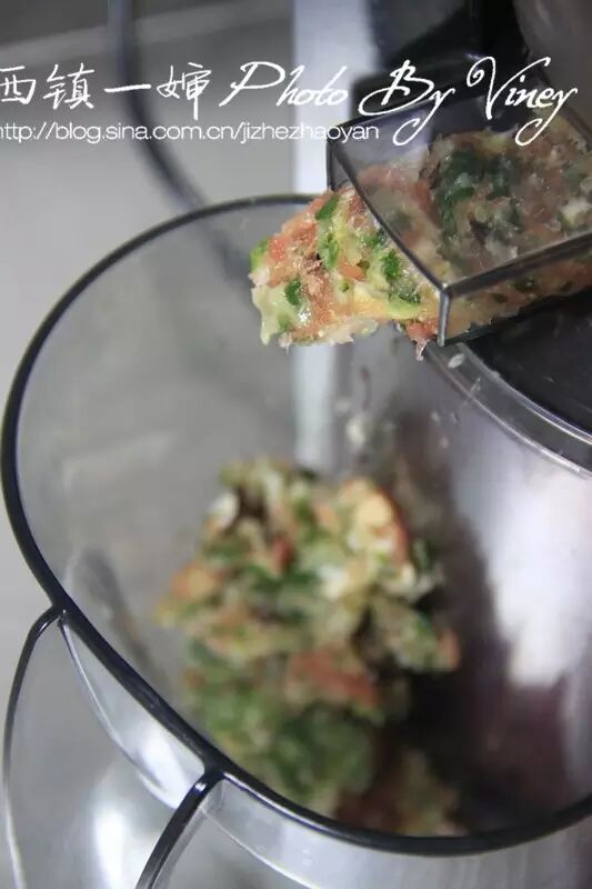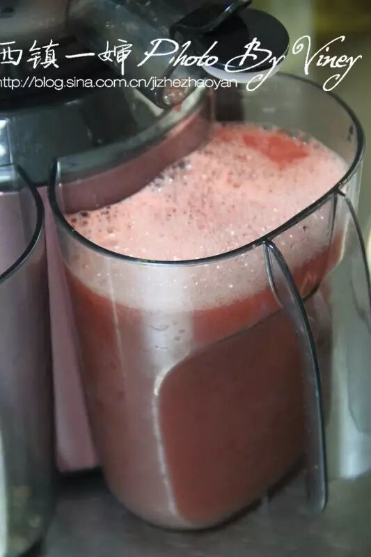 3、这时候能听到黄瓜被螺旋轴碾碎的声音,看见果汁了吧,因为西瓜冰镇过,所以内壁就出了一层哈气。
